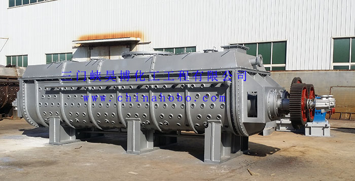 1、用導熱油做熱介質,槳葉干燥機可完成低溫煅燒工作。如:二水硫酸鈣(Ca2SO4·2H2O) 煅燒轉化為半水硫酸鈣(Ca2SO4·1/2H2O)。碳酸氫鈉(NaHCO3)經(jīng)煅燒 轉化為純堿(Na2CO3)等。